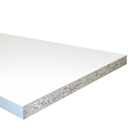 A white Melamine faced chipboard, suitable for shelving and other internal applications.
